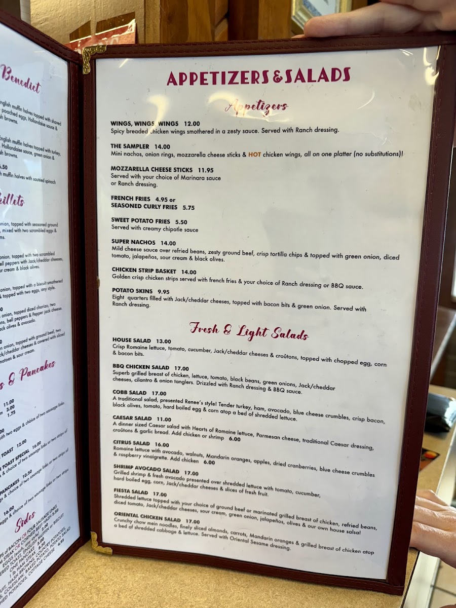 The menu offers a variety of options organized into several key categories to accommodate different dining preferences throughout the day. Breakfast items include skillets such as the Mexican Skillet and Veggie Skillet featuring country potatoes, scrambled eggs, cheeses, and a selection of toppings. The Eggs Benedict section provides multiple variations served with hash browns, including traditional and turkey-avocado options.